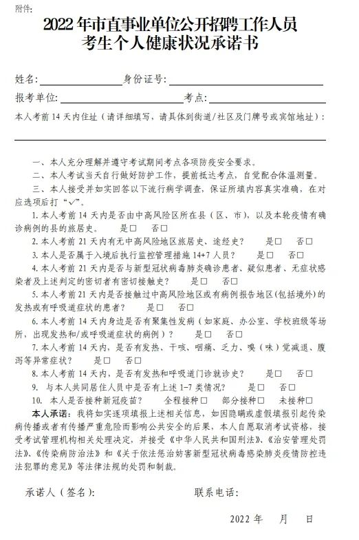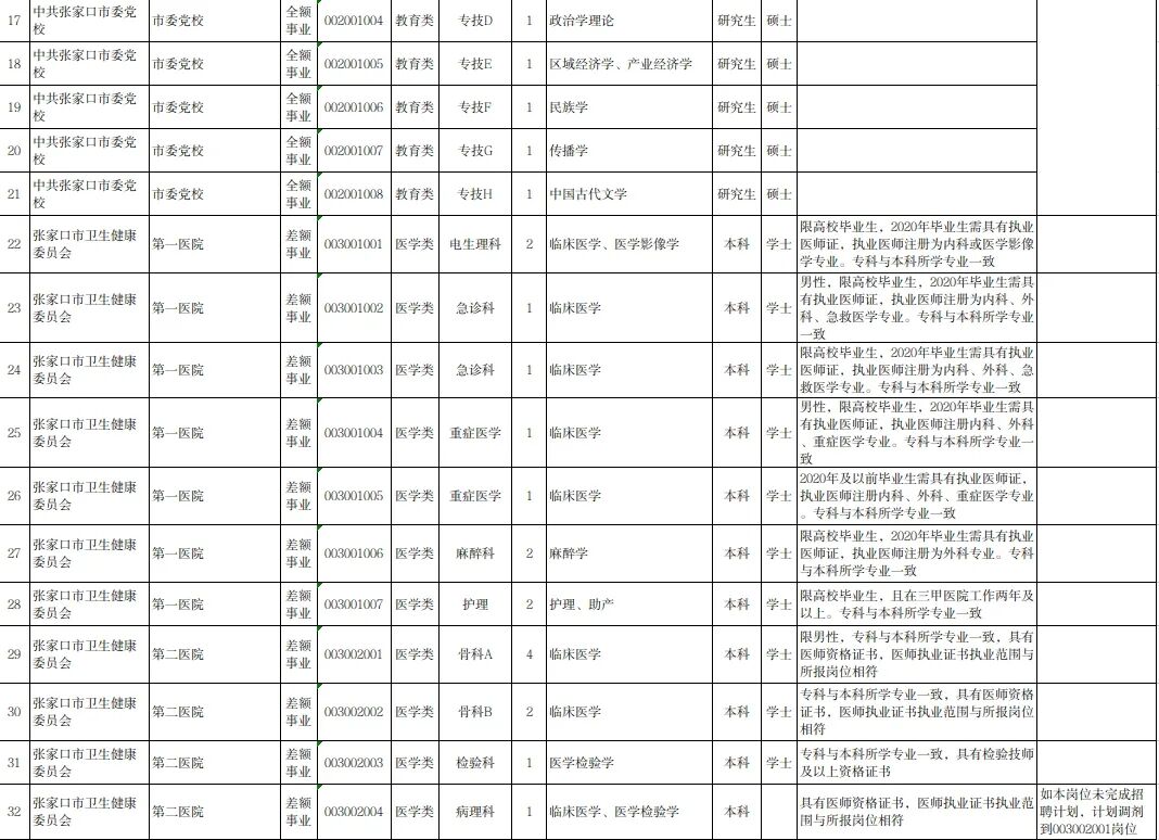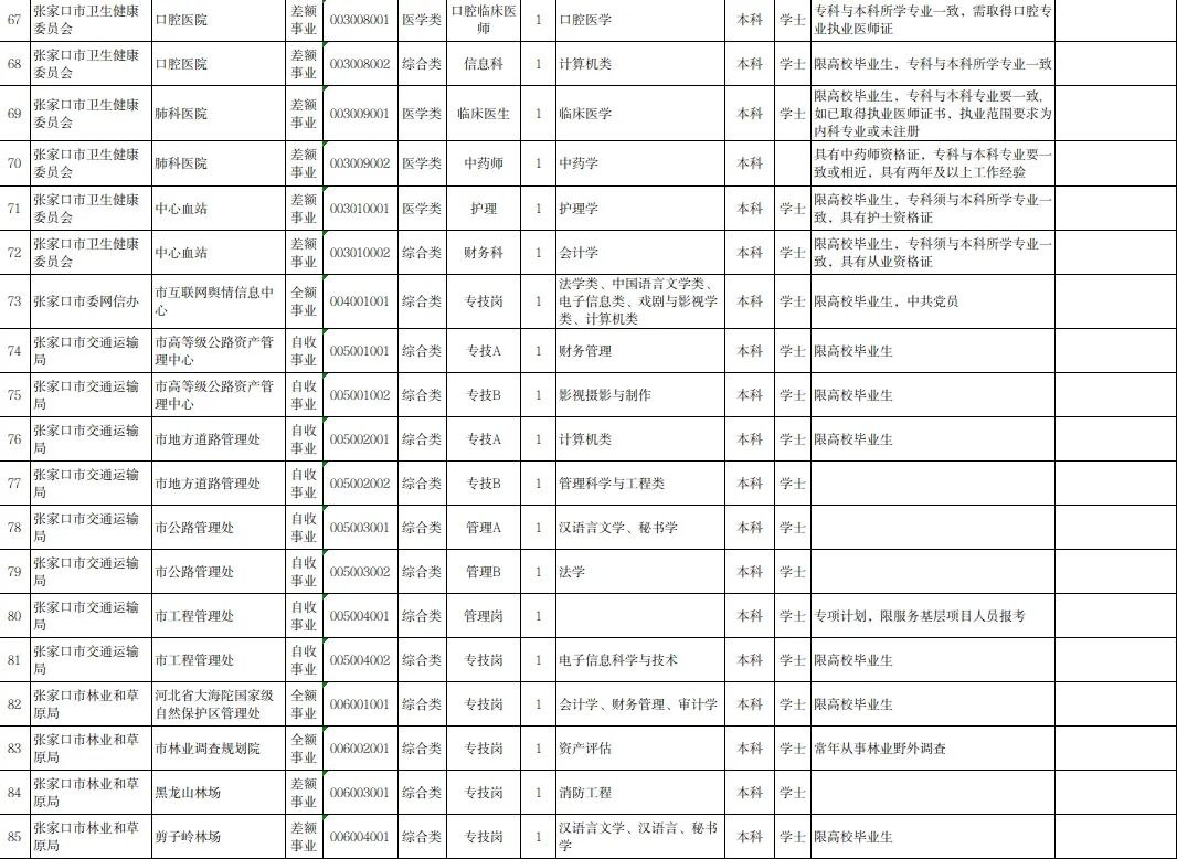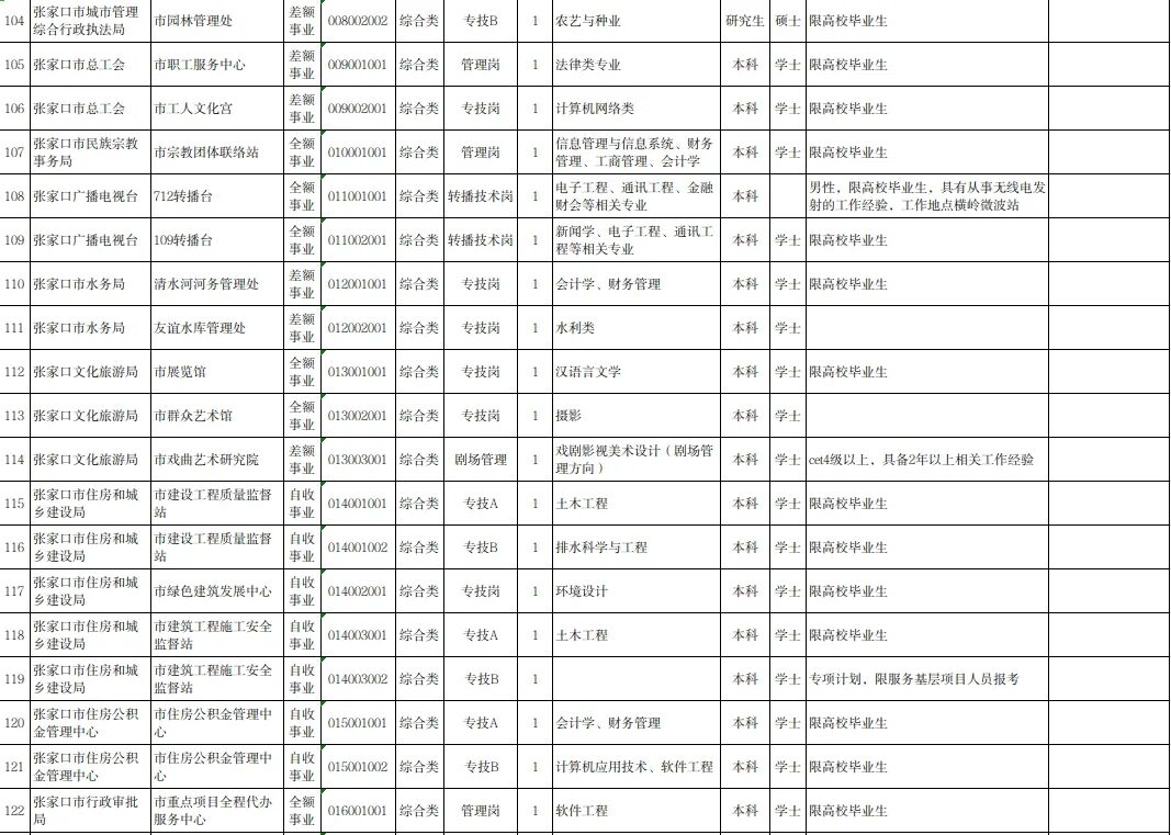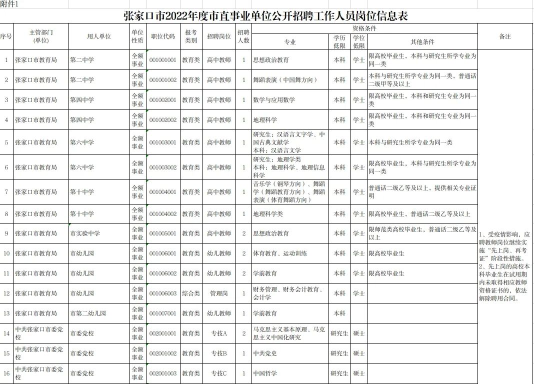 張家口2022年市直事業(yè)單位公開(kāi)招聘公告!附崗位信息表為滿(mǎn)足我市市直事業(yè)單位工作需要,依據《事業(yè)單位人事管理條例》及《河北省事業(yè)單位公開(kāi)招聘工作人員暫行辦法》等規定,決定面向社會(huì )公開(kāi)招聘市直事業(yè)單位工作人員154名,F公告如下: 一、招聘原則 堅持面向社會(huì )公開(kāi)招聘;堅持德才兼備及民主、公開(kāi)、競爭、擇優(yōu)的原則。 二、招聘條件 (一)招聘單位的崗位、數量和條件詳見(jiàn)《張家口市2022年市直事業(yè)單位公開(kāi)招聘工作人員崗位信息表》(附件1),并符合以下基本條件: 1、具有中華人民共和國國籍。 2、遵守憲法和法律,具有良好的品行和職業(yè)道德。 3、具有國家承認的大學(xué)本科及以上學(xué)歷的畢業(yè)生。 4、年齡在18周歲以上、35周歲以下(1986年6月21日至2004年6月21日期間出生)。博士研究生年齡可放寬到40周歲以下(1981年6月21日及以后出生)。招聘崗位對年齡有具體要求的從其要求。 計算年齡、工作經(jīng)歷、戶(hù)籍、檔案關(guān)系等時(shí)間的截止日期為2022年6月21日。其中,在大學(xué)期間的社會(huì )實(shí)踐(實(shí)習)經(jīng)歷,不視為工作經(jīng)歷。 5、具有正常履行職責的身體條件,參照公務(wù)員錄用體檢通用標準(國人部發(fā)〔2005〕1號文件印發(fā)、人社部發(fā)〔2016〕140號文件修訂)進(jìn)行體檢。 6、具備與招聘崗位要求相適應的年齡、學(xué)歷、專(zhuān)業(yè)、任職資格、工作經(jīng)歷等條件。根據國務(wù)院辦公廳《關(guān)于進(jìn)一步做好高校畢業(yè)生等青年就業(yè)創(chuàng )業(yè)工作的通知》(國辦發(fā)〔2022〕13號)中“受疫情影響嚴重地區,在2022年12月31日前可實(shí)施中小學(xué)、幼兒園、中等職業(yè)學(xué)校教師資格‘先上崗、再考證’階段性措施”的有關(guān)精神,此次招聘教師崗位對教師資格證不再要求,“無(wú)教師資格證可以報名應聘,但須在入職后一年內取得相應教師資格,因個(gè)人原因未取得的,予以解聘”。 7、通過(guò)自學(xué)考試、成人教育、網(wǎng)絡(luò )教育、夜大、電大等非普通高等學(xué)歷教育形式取得的學(xué)歷(學(xué)位)須于2022年6月21日前取得;普通高等學(xué)歷教育(非在職)應屆畢業(yè)生須于2022年7月31日前畢業(yè)取得學(xué)歷(學(xué)位);留學(xué)回國人員須于2022年7月31日前取得國(境)外學(xué)位并完成教育部留學(xué)服務(wù)中心學(xué)歷認證。 8、職業(yè)院校畢業(yè)生報考時(shí),在符合專(zhuān)業(yè)等其他條件的前提下,全日制技工院校中級工班、高級工班、預備技師(技師)班畢業(yè)生分別參照中專(zhuān)、大專(zhuān)、本科畢業(yè)學(xué)歷,在事業(yè)單位工作人員招聘等方面享受同等待遇。 9、本次招聘部分崗位僅限高校畢業(yè)生報名,根據中共中央組織部辦公廳 人力資源社會(huì )保障部辦公廳《關(guān)于應對新冠肺炎疫情影響做好事業(yè)單位公開(kāi)招聘高校畢業(yè)生工作的通知》(人社廳發(fā)〔2020〕27號),《崗位信息表》中的“高校畢業(yè)生”包括以下人員: (1)納入國家統招計劃、被普通高等院校錄取、畢業(yè)后持有普通高校畢業(yè)生就業(yè)報到證的2022年高校畢業(yè)生。 (2)國家統一招生的2020年、2021年普通高校畢業(yè)生擇業(yè)期內未落實(shí)工作單位,其檔案關(guān)系仍保留在原畢業(yè)學(xué)校,或保留在各級畢業(yè)生就業(yè)主管部門(mén)(畢業(yè)生就業(yè)指導服務(wù)中心)、各級人才交流服務(wù)機構和各級公共就業(yè)服務(wù)機構的高校畢業(yè)生。 (3)普通高等院校在校生或畢業(yè)當年入伍,退役后(含復學(xué)畢業(yè))2年內未落實(shí)工作單位的退役士兵。 (4) 2022年取得國(境)外學(xué)位并完成教育部門(mén)學(xué)歷認證的留學(xué)回國人員,以及2020年、2021年取得國(境)外學(xué)位并完成教育部門(mén)學(xué)歷認證且未落實(shí)工作單位的留學(xué)回國人員。 10、崗位條件中“服務(wù)基層項目人員”指:應屆畢業(yè)生中服務(wù)北京冬奧會(huì )冬殘奧會(huì )的大學(xué)生志愿者和在張家口市服務(wù)且2022年當年服務(wù)期滿(mǎn)的“農村義務(wù)教育階段學(xué)校教師特設崗位”計劃、“三支一扶”計劃、“大學(xué)生志愿服務(wù)西部”計劃人員以及從張家口入伍(含生源地)的2年內未落實(shí)工作單位“退役大學(xué)生士兵”報考!巴艘鄞髮W(xué)生士兵”是指以下兩類(lèi)人員:一是從張家口市應征入伍、服役期滿(mǎn)退出現役,入伍前取得普通高等教育大學(xué)本科以上學(xué)歷的退役士兵;二是大學(xué)期間從張家口市應征入伍、服役期滿(mǎn)退出現役后復學(xué),取得普通高等教育大學(xué)本科以上學(xué)歷的退役士兵。 (二)本次招聘不受理下列人員報名: 1、在讀非應屆普通高校學(xué)生(不含2022年應屆畢業(yè)生); 2、試用期內的公務(wù)員和試用期內的事業(yè)單位工作人員; 3、現役軍人; 4、被依法列為失信聯(lián)合懲戒對象的; 5、被開(kāi)除中國共產(chǎn)黨黨籍的; 6、曾因犯罪受過(guò)刑事處罰和被開(kāi)除公職的人員; 7、未經(jīng)原單位同意或行業(yè)有規定不得應聘的機關(guān)事業(yè)單位正式在編人員; 8、應聘人員不得報考聘用后即構成回避關(guān)系的招聘崗位;