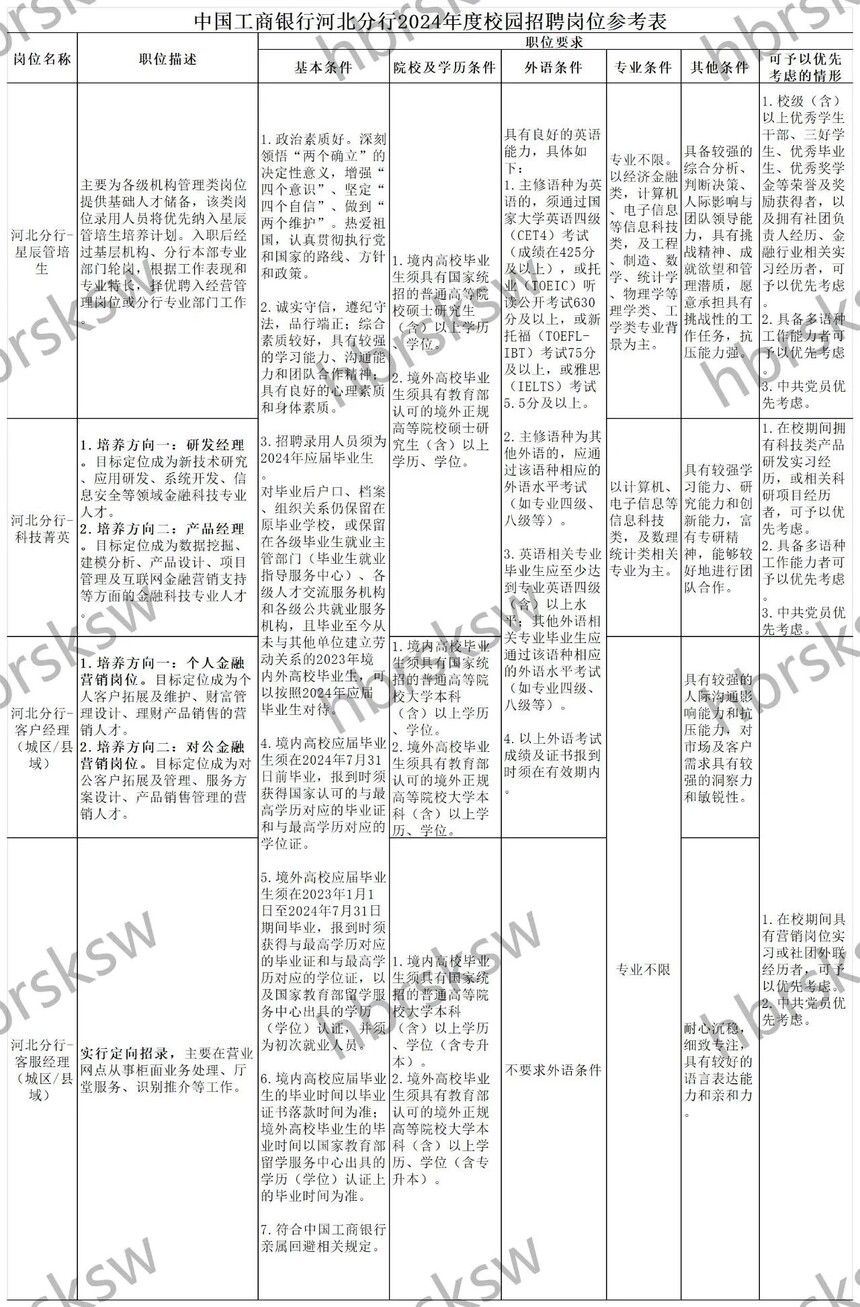 中國工商銀行河北分行2024年度校園招聘780人公告中國工商銀行河北分行是總行授權經(jīng)營(yíng)的一級分行,在河北省內設有各類(lèi)機構800個(gè),全部存款余額達到1.27萬(wàn)億元,各項貸款余額突破1萬(wàn)億元,向省內外廣大對公客戶(hù)和個(gè)人客戶(hù)提供全面金融產(chǎn)品和服務(wù),是工商銀行系統內規模較大的一級分行之一。當前,中國工商銀行正在致力于全面建設具有中國特色的世界一流現代金融企業(yè)這一愿景,深入踐行金融工作政治性、人民性,堅定不移走中國特色金融發(fā)展之路。誠邀您的加入,在工商銀行高質(zhì)量發(fā)展新征程上共筑夢(mèng)想!點(diǎn)擊查看更多招聘信息 一、招聘機構 中國工商銀行河北分行。 二、招聘范圍 面向境內、境外高校畢業(yè)生,畢業(yè)時(shí)間為2023年1月至2024年7月。 三、招聘崗位(780人) 。ㄒ唬┬浅焦芘嗌。主要為各級機構管理類(lèi)崗位提供基礎人才儲備,該類(lèi)崗位錄用人員將優(yōu)先納入星辰管培生培養計劃。 。ǘ┛萍驾加。主要甄選產(chǎn)品研發(fā)、用戶(hù)研究、大數據研究等領(lǐng)域的科技專(zhuān)業(yè)人才。 。ㄈ┛蛻(hù)經(jīng)理。主要為零售與對公金融營(yíng)銷(xiāo)崗位引進(jìn)適用性人才。新員工錄用后原則上先安排至基層營(yíng)業(yè)網(wǎng)點(diǎn)進(jìn)行一定期限的培養鍛煉,之后根據個(gè)人工作表現及工作需要等,聘入相應崗位工作。點(diǎn)擊查看更多招聘信息 。ㄋ模┛头(jīng)理。實(shí)行定向招錄,主要在營(yíng)業(yè)網(wǎng)點(diǎn)從事柜面業(yè)務(wù)處理、廳堂服務(wù)、識別推介等工作,新員工錄用后原則上在該崗位工作不少于5年。 四、工作地點(diǎn) 中國工商銀行河北分行轄內各機構,其中縣域機構定向服務(wù)期不少于5年。 五、招聘條件 各崗位招聘條件詳見(jiàn)招聘職位。 六、注意事項 。ㄒ唬┍敬握衅缚赏ㄟ^(guò)PC端或手機移動(dòng)端進(jìn)行線(xiàn)上報名申請。 。ǘ┱衅赋绦蛑懈鳝h(huán)節成績(jì)對本次招聘有效。 。ㄈ┱衅钙陂g,我行將通過(guò)招聘系統信息提示、手機短信或電子郵件等方式與應聘者聯(lián)系,請保持通信暢通。 。ㄋ模⿷刚邞獙ι暾堎Y料信息的真實(shí)性負責。如與事實(shí)不符,我行有權取消其應聘資格,解除相關(guān)協(xié)議約定。 。ㄎ澹┪倚袕奈闯闪⒒蛭谐闪⑷魏慰荚囍行、命題中心等機構或類(lèi)似機構,從未編輯或出版過(guò)任何校園招聘考試參考資料,從未向任何機構提供過(guò)校園招聘考試相關(guān)的資料和信息。 。┝私飧嗾衅赣嵪⒓跋嚓P(guān)動(dòng)態(tài),敬請關(guān)注“中國工商銀行人才招聘”微信公眾號。 。ㄆ撸┲袊ど蹄y行對本次招聘享有最終解釋權。點(diǎn)擊查看更多招聘信息 附件:中國工商銀行河北分行2024年度校園招聘崗位參考表